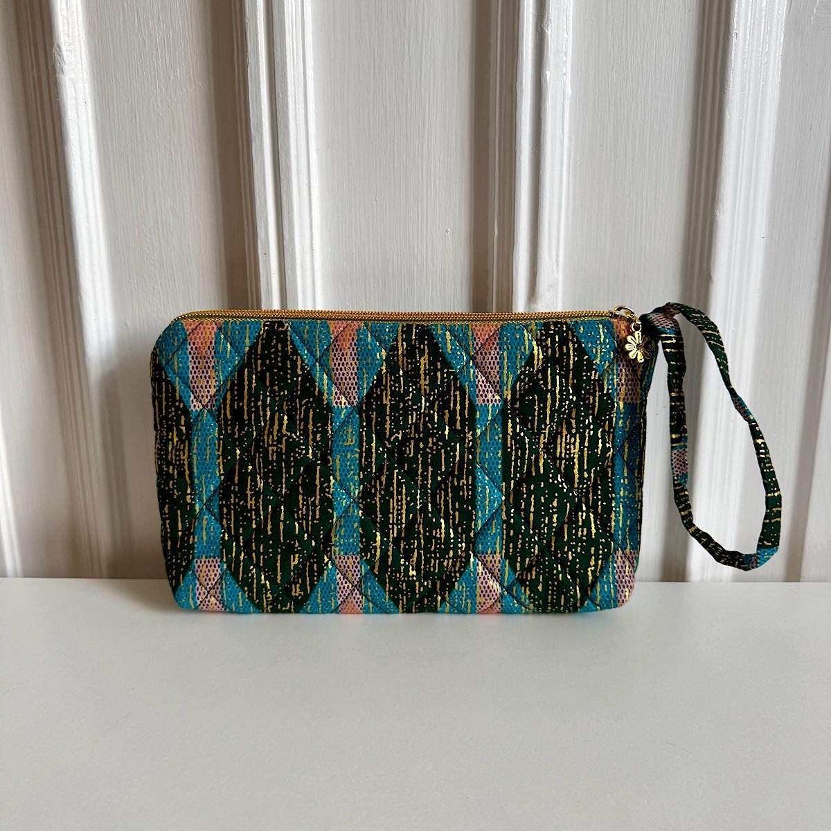 Quiltet clutch med håndledsrem – smukt print med gulddetaljer