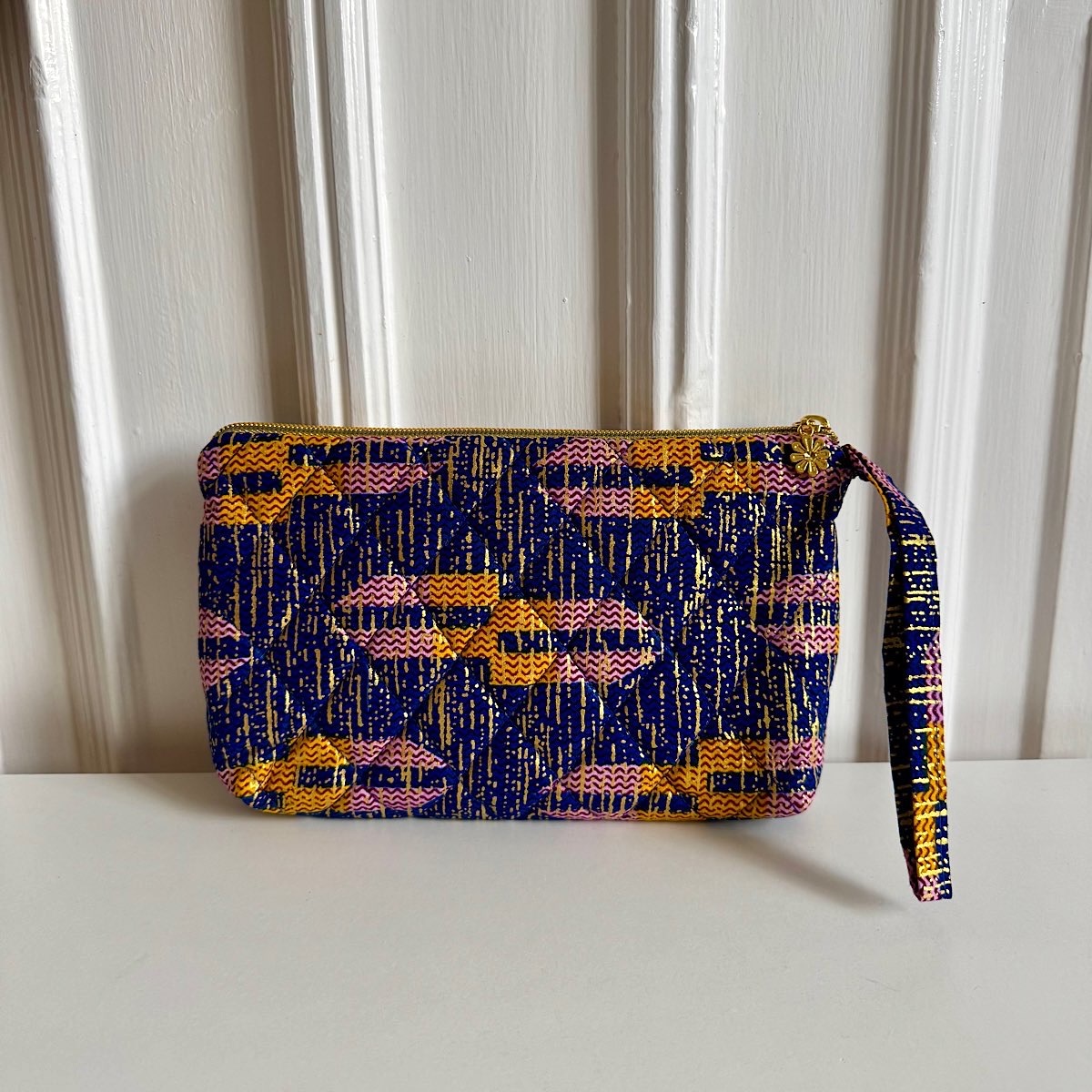 Quiltet clutch med håndledsrem – smukt print med gulddetaljer