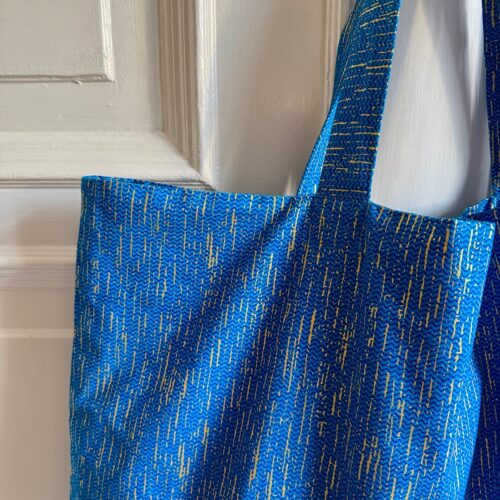 Hver taske produceres i meget begrænset antal, da stoffet kun findes i små mængder, og alle tasker syes på en lille lokal systue i Nairobi. For at udnytte hele stoffets print er hver taske helt unik, og der vil derfor være små variationer i mønster og placering i forhold til produktbilledet – præcis dét, der gør din taske helt særlig.