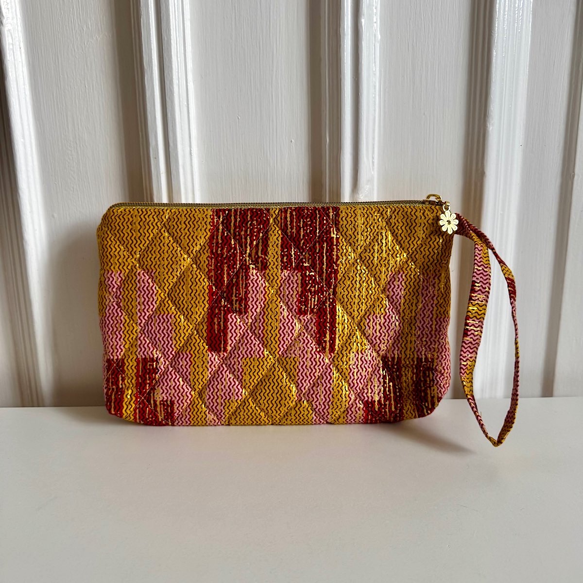 Quiltet clutch med håndledsrem – smukt print med gulddetaljer