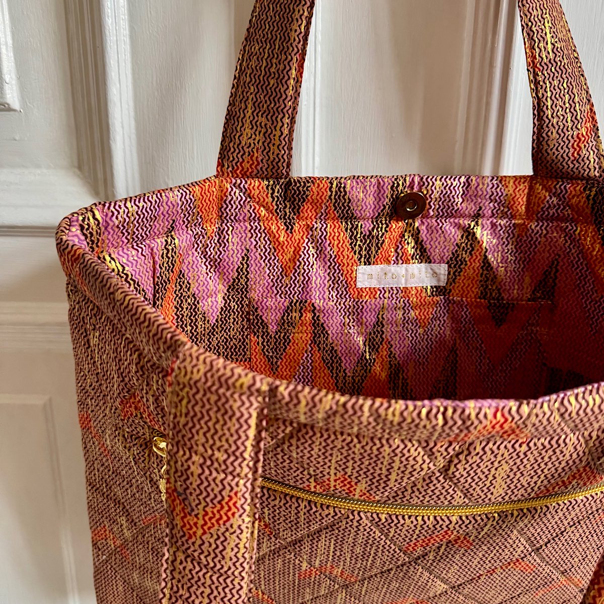 Hver taske produceres i meget begrænset antal, da stoffet kun findes i små mængder, og alle tasker syes på en lille lokal systue i Nairobi. For at udnytte hele stoffets print er hver taske helt unik, og der vil derfor være små variationer i mønster og placering i forhold til produktbilledet – præcis dét, der gør din taske helt særlig.